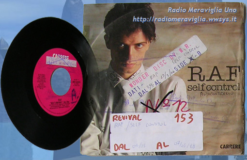 Disco Meraviglia n°12 (Wonder Disc dal 20/03 al 29/03/1984) Autore e cantante: *Raf* - singolo esordio: *Self Control*(lato B). *Raf* (Raffaele Riefoli) cantautore, nato a Margherita di Savoia il 29/09/1959, è sposato dal 1996 con la soubrette Gabriella Labate, che gli ha dato due figli: Bianca (1996) e Samuele (2000). Self Control è stato anche Disco Revival n°153 dal 04 al 07/05/88.