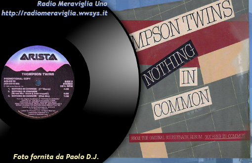 Gruppo: *Thompson Twins* - disco: *Nothing in common*. Canzone della band britannica, pubblicata nel 1986 come singolo dalla colonna sonora del film drammatico comico americano "Nothing in Common". Scritta da Alannah Currie e Tom Bailey e prodotta da Geoffrey Downes e Bailey. Con l'abbandono della band di Joe Leeway, "Nothing in Common" è stata la prima uscita dei Thompson Twins in versione duo.
